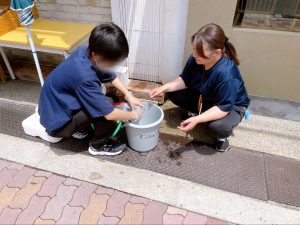 もちろんモップを洗うのも初めてだったので、職員が横でレクチャーしながらチャレンジしてもらいました?