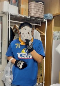 ホラー映画のジェイソンをモチーフにした手作りのお面をかぶって