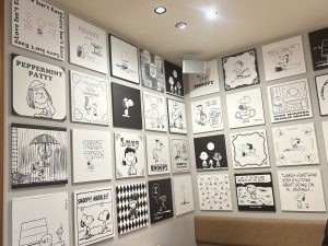 お店に入ると、まず目に飛び込んでくるのが壁いっぱいのスヌーピーのイラストたち。