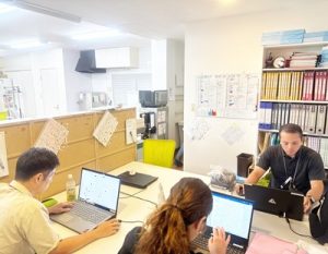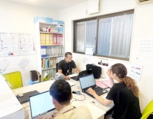 写真は利用者さんが帰った後の移行スタッフの様子です。