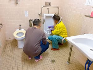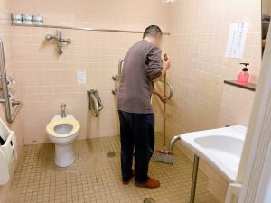 今月から新たに仲間入りしたKさんが清掃現場にも入ることとなり、現場での訓練がスタートしました?