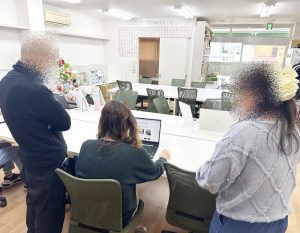 ワープロ検定試験日の前日です。この日は土曜日にもかかわらず、可能な限り練習したいと、みなさん通所してくれました。それを支援する笹田さんも一生懸命にサポートしていました!緊張感がヒシヒシと伝わってきます!
