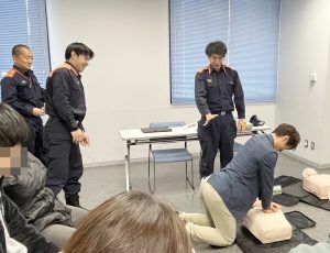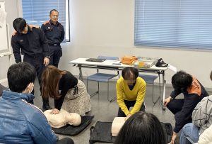 胸骨圧迫の講習を受けて、正しい手の位置や強さ、テンポの大切さを実際に