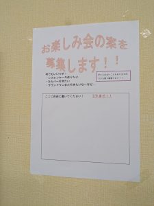 さて今回は利用者さんのしたい事が出来る可能性があるので、通所された方は添付の用紙に気軽に何でも書いてくださいね?