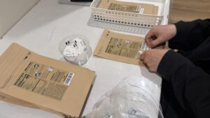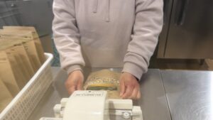 パッケージシールを貼って、中身を計量して重鎮して、